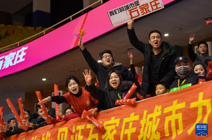 1月13日,石家庄翔蓝队球迷在比赛中为球队加油。